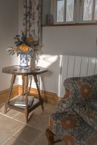 Room ‘NOT2B’ has two single beds which can be separate or moved together if requested. It has pine paneled head boarding, a stone tiled floor, a comfy seating area, TV and free wifi,  tea/coffee making facilities, fluffy towels and sumptuous cotton bed linen, electric heating – and also has a separate en-suite shower/loo/wash room with electric towel rail. Well behaved dogs can be accommodated in this room – please pre-arrange with Charlie in advance of your arrival – for a small extra charge per night.